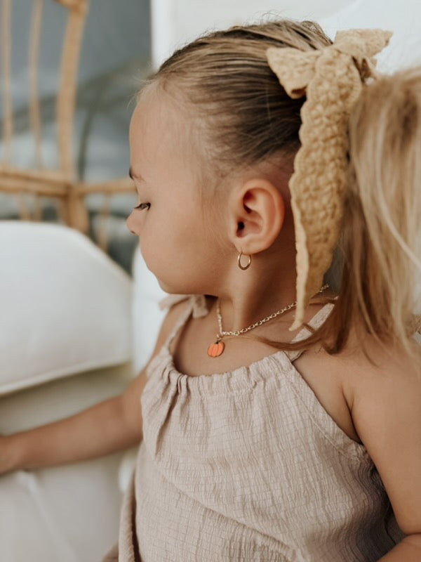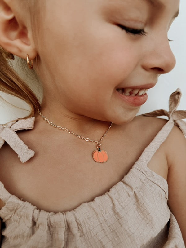 The dainty pumpkin necklace is a sweet and simple way for your Mini to celebrate the magic of Halloween and the cozy fall season.