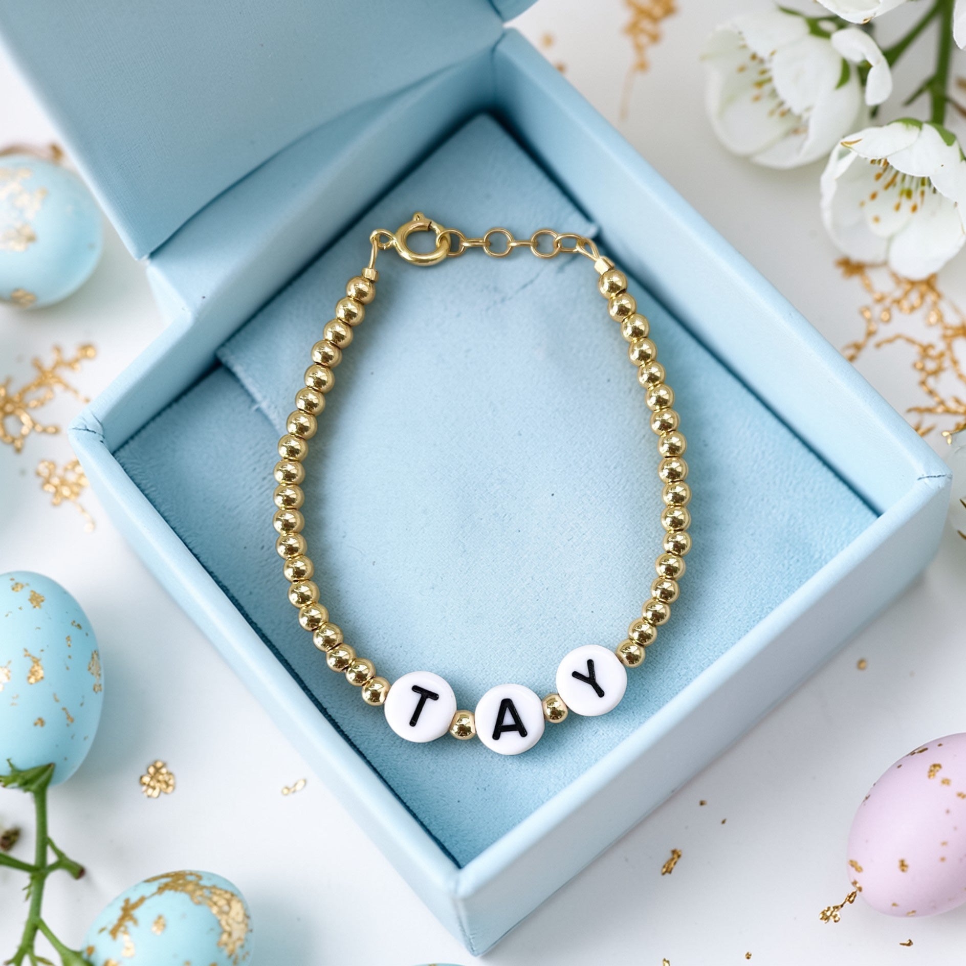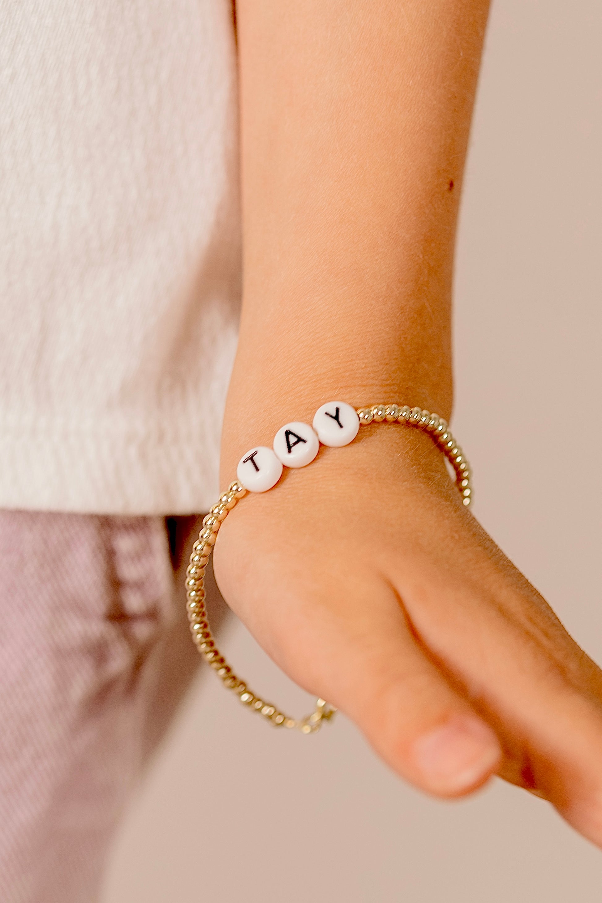 - Materials: Tarnish-resistant, 14K gold-plated beads, personalized with your lil' babes name in glass letter beads.