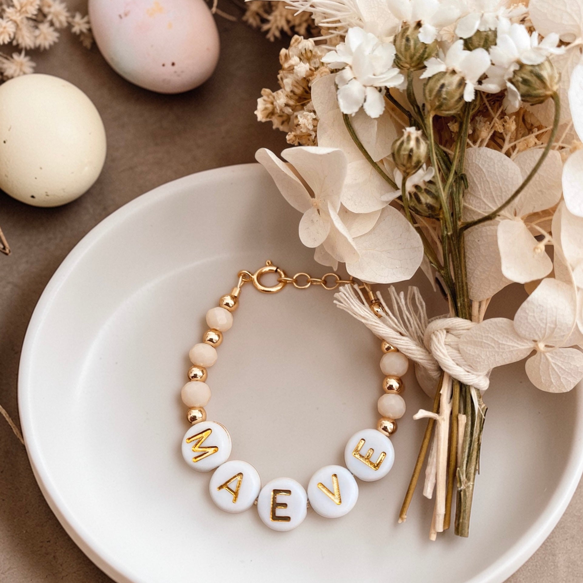 Materials: Cream colored rondelles accented with tarnish-resistant, 14K gold-plated beads. Personalized with your lil' babes name in glass letter beads.